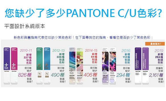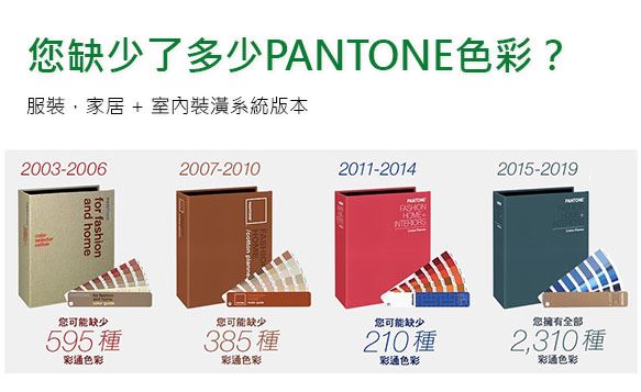 我們很高興您喜愛彩通的色彩指南與色票本。不過,色彩指南與色票本無法永垂不朽。定期更新可以確保您擁有的是範圍最廣、最準確呈現、可實現的潮流色彩。不幸的是,即使是最細心的維護也無法預防色彩因為暴露在光線與溼氣下而褪色,頁面、色票及布卡因為經常的接觸會汙漬或變色。但是,更新指南最普遍的原因是要獲得最新、潮流導向的彩通服裝,家居 + 室內裝潢 [Pantone Fashion, Home + Interiors] 色彩以及經過改良的產品格式。
